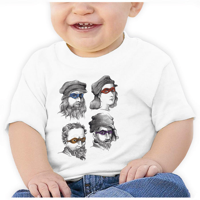 Playera Bebé De: Tortugas Ninja, Artistas renacentistas TMNT. Impresión digital de alta calidad, suave al tacto y muy duradera, Hecha en México.